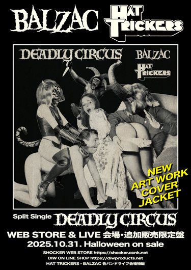 2025年9月13日新宿LOFT『DEADLY CIRCUS』にて発売いたしましたBALZAC & HAT TRICKERSのアナログ盤7インチSPLIT SINGLE『DEADLY CIRCUS』がNEWデザインのアートワークジャケットで枚数限定のアンコール発売決定!