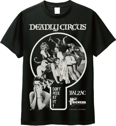 BALZACのHIROSUKEによるDEADLY CIRCUSロゴデザインを使い、HAT TRICKERSのCLOCK WORK KENJIによるアートワークのコラボレーションTシャツとなってます。