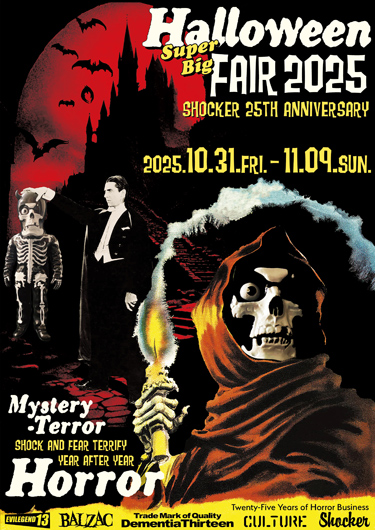 今回のフェアでは、25周年アイテムをはじめ、BALZACマーチャンダイズ、SHOCKER、DEMENTIA THIRTEEN、CULTURE各ブランドのアイテム、恒例のHALLOWEEN SKULLMAN 2025年版など、多数の商品が発売となります。