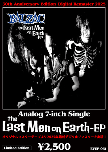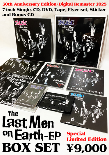 単体発売と同時に『THE LAST MEN ON EARTH -EP』限定BOXセットが発売となります。 アナログ盤7インチをはじめ、『THE LAST MEN ON EARTH』に関するCD、DVD、カセットテープの4大フォーマットアイテムを収納した限定BOXとなります。1995年のBALZACのライブ映像をはじめ、当時のオリジナルフライヤーの復刻コピーなど貴重な記録がインサイドスリップケース仕様のクリアBOXに収納されております。