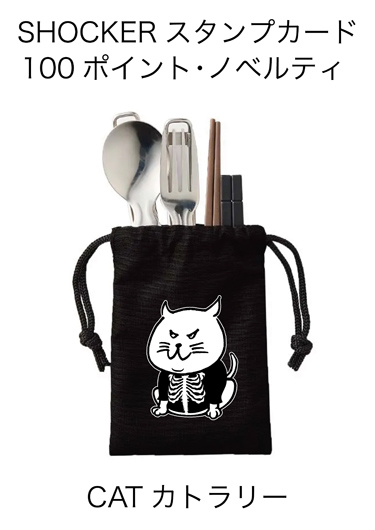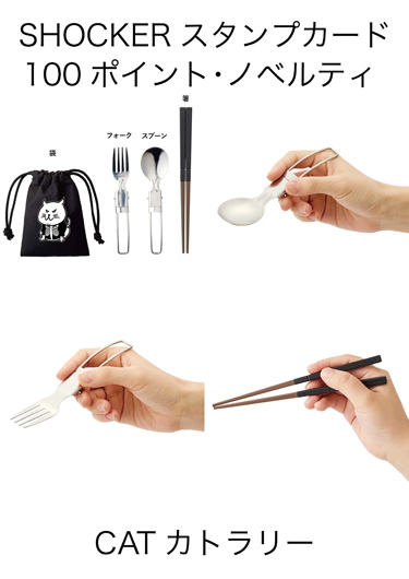 SHOCKER 25周年企画シリーズ第2弾の11月22日(土)よりSHOCKERスタンプカード100ポイントノベルティのニューアイテムとなるフォーク、スプーン、お箸がセットとなったカトラリーが登場!